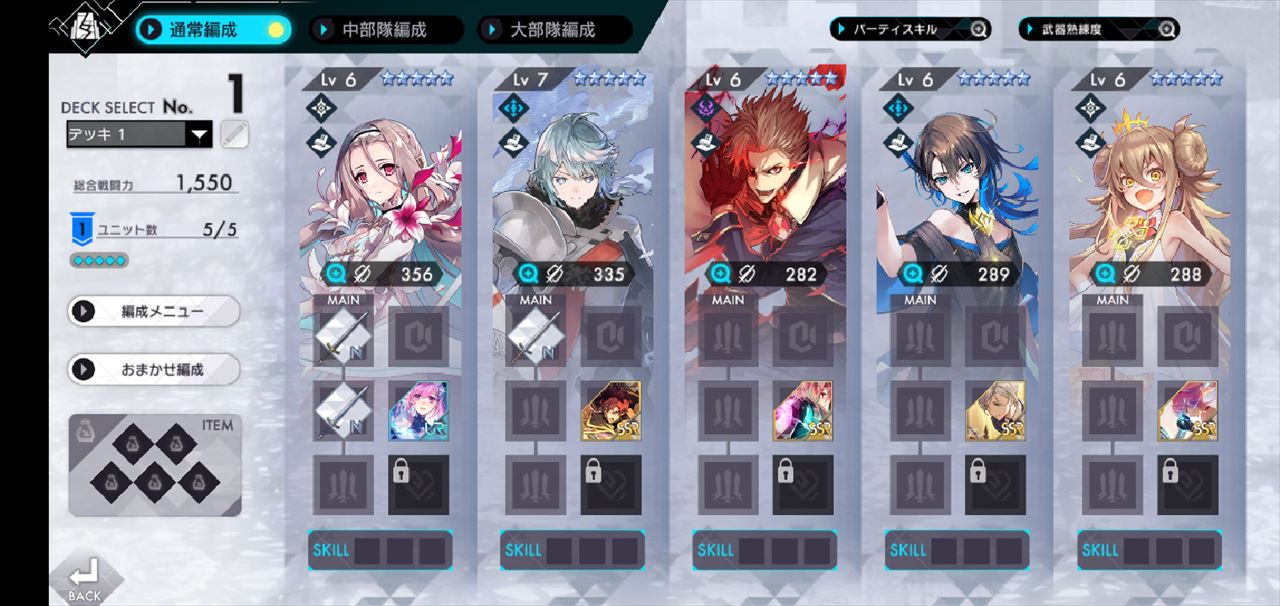 ところがしょっぱなからあまりにもダウンロード容量がデカすぎてこれ事前ダウンロードの意味ねぇだろ状態だったのでリセマラを開始したのが夜9時頃…あまり拘ってもキリがないのでとりあえず以下のメンバーで始めることにしました。