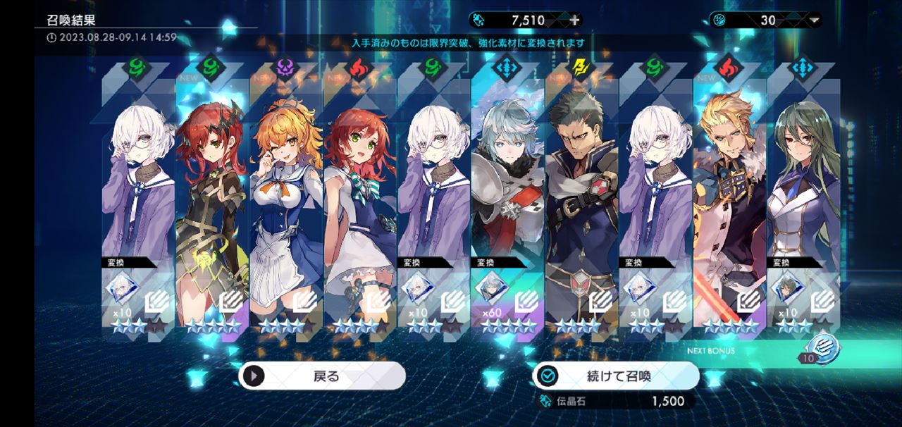 ここからはイベントに向けて石をキープしておくつもりでしたが、正直いつまで続くかわからないし無課金じゃどうせその内についていけなくなるだろうなと今いるキャラだけでも凸っていくことにしました。キャラが増えるほど凸りにくくなるのは間違いないと思われるので。