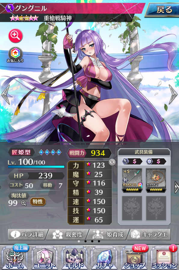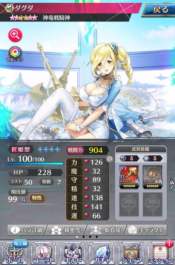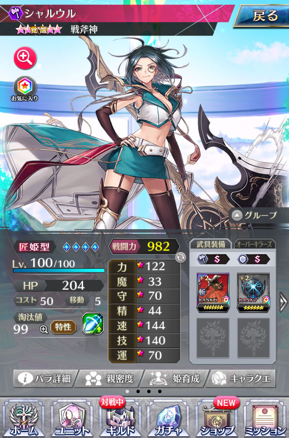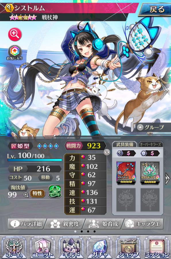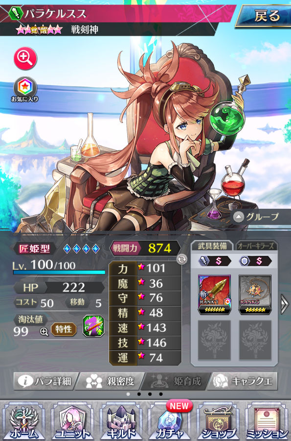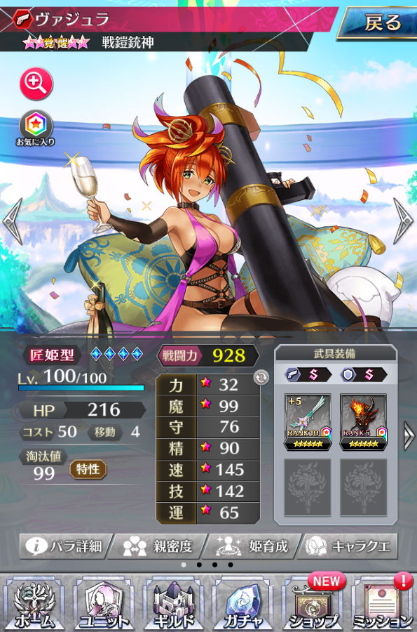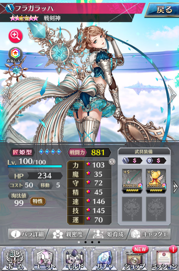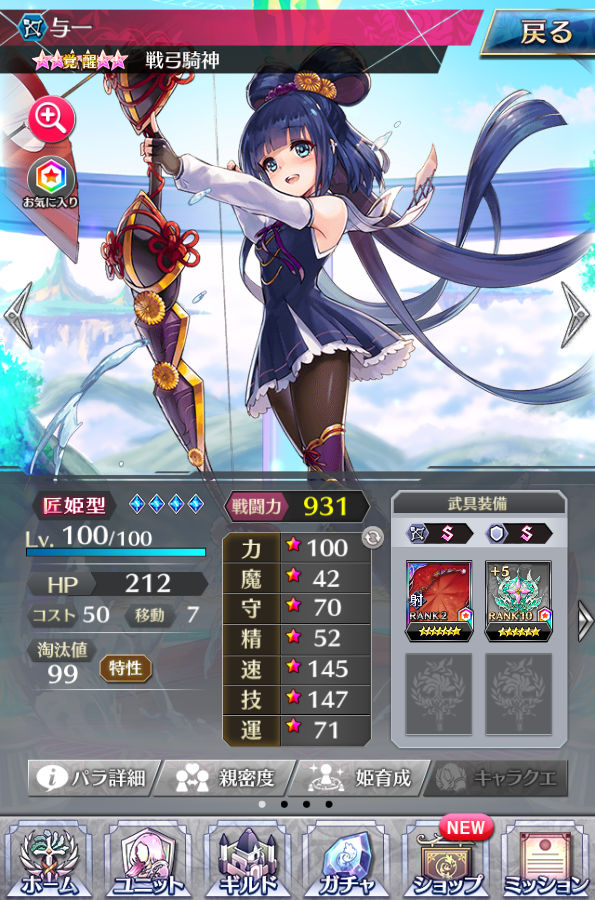 ユニットの強さはスキルによる部分が大きいのでステータスだけ見せたところでイマイチ伝わりにくいとは思いますが、あくまでも参考程度にという事で私が覚醒させたキル姫達のステータス画面を貼り付けてみますね?