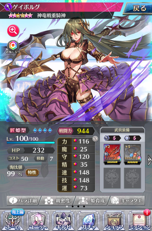 また、覚醒ユニットにはそのキャラクター専用(覚醒ユニット以外も装備可能)の神器と呼ばれる武器が順次実装されていくのでそれも楽しみの一つとなっています。中には天沼矛のように槍なのに射程1でクソデカため息をつかされる事もありますが、草薙剣のように神器で大化けする可能性もあるのでお気に入りのキャラクターの神器が残念性能にされないよう祈りましょう。