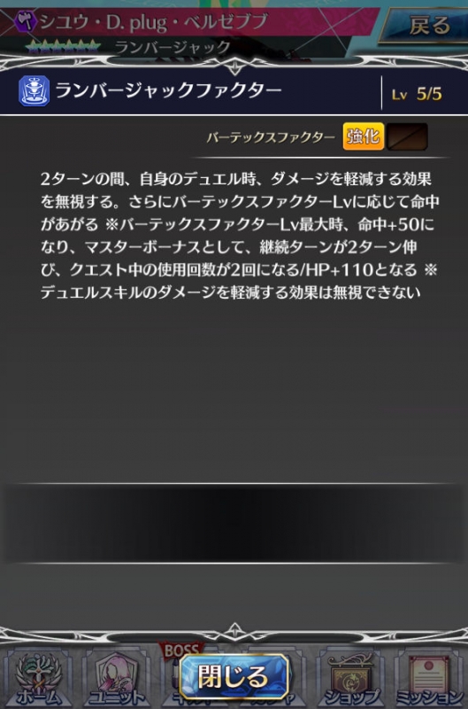 ターン制限は無い事ですしとりあえずバフは盛っといた方がいいのかな?という事で、1ターン目に四業『暴食皇帝』、2ターン目にランバージャック ファクターを発動してみました。