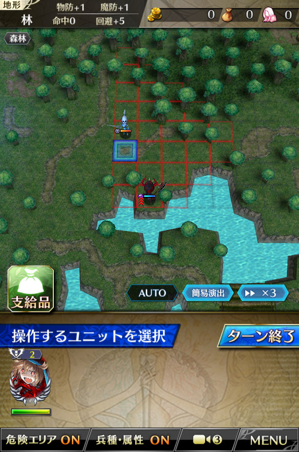 3ターン目に画像の位置から初期配置の敵を倒すと次のターン開始時には次のマップのようになるかと思います。